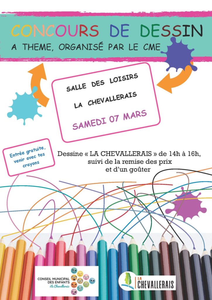 Les jeunes élus du Conseil Municipal des Enfants invitent les habitants de 6 à 199 ans à participer à leur évènement, le samedi 7 mars de 14h à 16h, salle des Loisirs. Concours de dessin sur le thème « Dessine moi Ta Chevallerais » sur une feuille de format A4. Il faut venir avec ses crayons feutre ou de couleur. Il y aura un goûter le temps de la délibération des deux enseignantes, Laurence Vidot de l’Ecol’eau et Lise Leduc de l’école Saint Aubin, pour élire les plus beaux dessins.