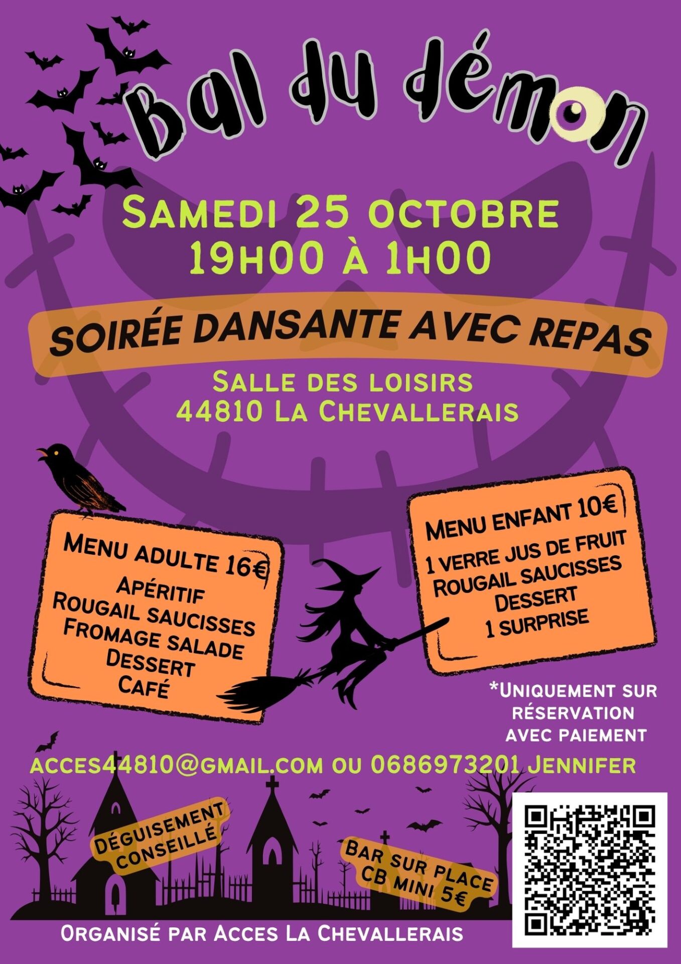 Le bal du démon revient le samedi 25 octobre ! Repas et soirée sur réservation, venez fêter Halloween dans une ambiance terriblement effrayante ! Tenue de soirée exigée, de 19h à 1h, salle des loisirs. Réservation : acces44810@gmail.com. Malheureusement, faute de bénévoles, la fameuse marche des sorcières, prévue le lendemain, est annulée cette année…