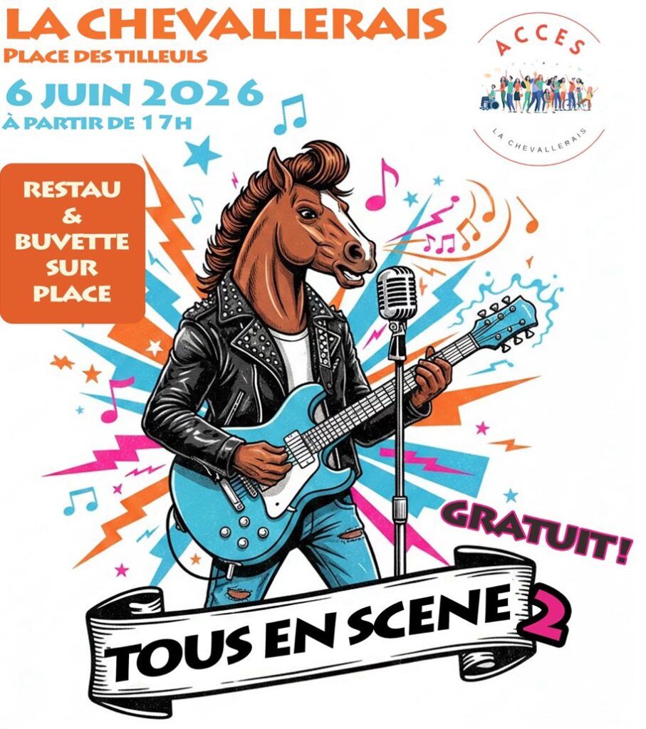 L’association chevalleraisienne ACCES remet le couvert ! Elle vous concocte une 2ème édition de son festival « Tous en scène », fête de la musique programmée dans le superbe cadre de la Place des Tilleuls, derrière la mairie. RDV le samedi 6 juin à partir de 17h (et jusqu’à 1h). Bar et restauration sur place.