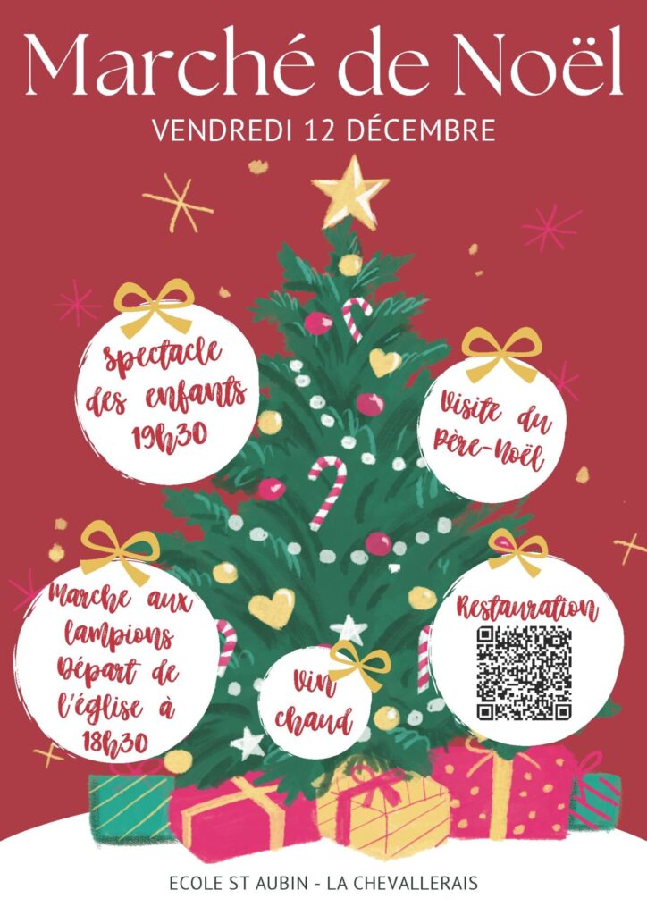 Oh oh oh ! Le Père Noël fera un nouveau passage furtif à La Chevallerais le vendredi 12 décembre à l’occasion du marché de Noël de l’école Saint-Aubin. C’est l’association de l’école, l’APEL, qui l’accueillera et qui, pour l’occasion, a préparé quelques animations : un marché aux lampions dès 18h30 au départ de l’église puis un spectacle des enfants au théâtre de la commune à 19h30. Vous pouvez d’ores et déjà commander des parts de tartiflette via le QR code sur l’affiche. Vous pourrez également déguster des pâtisseries sur place ou trinquer au vin chaud à l’année 2026 qui approche…